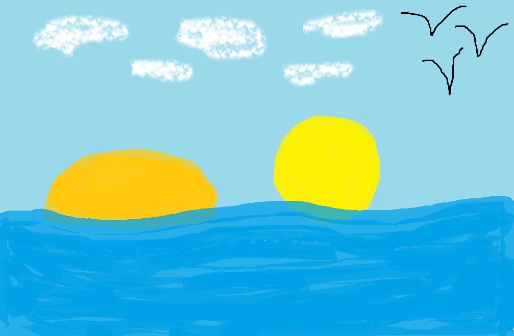 3. Выберите оранжевый цвет и круглую Кисть. Нарисуйте на горизонте два полукруга, изображая солнце и его отражение или песчаный берег.